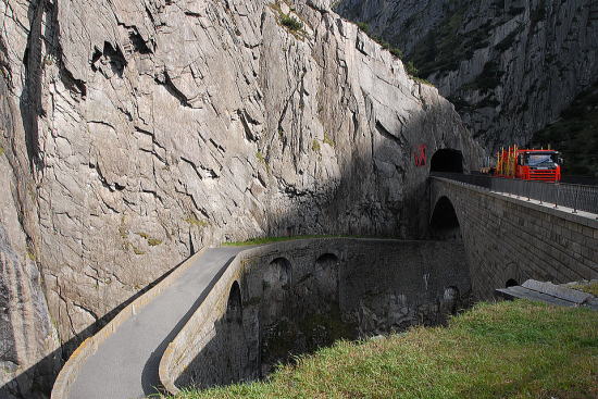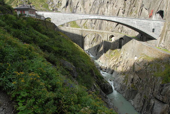 | 「悪魔の橋」スイスアルプス写真紀行よりお借りしました。上が国道です。猛スピードで走っていて停まることができませんでした。旧道をかけるのに雪融け水も多く大変な苦労があったそうです。 | 「悪魔の橋」スイスアルプス写真紀行よりお借りしました。タイムスリップした気持ちになれます。古代から峠の存在は知られていたが13世紀前半までは一般的に交通路としては用いられなかった。初夏に雪融け水で溢れるシェレネン渓谷の急流を渡河し、アンデルマットまでの狭くきつい坂道を通り抜けなくてはならなかった。(ウィキペディアより) |
