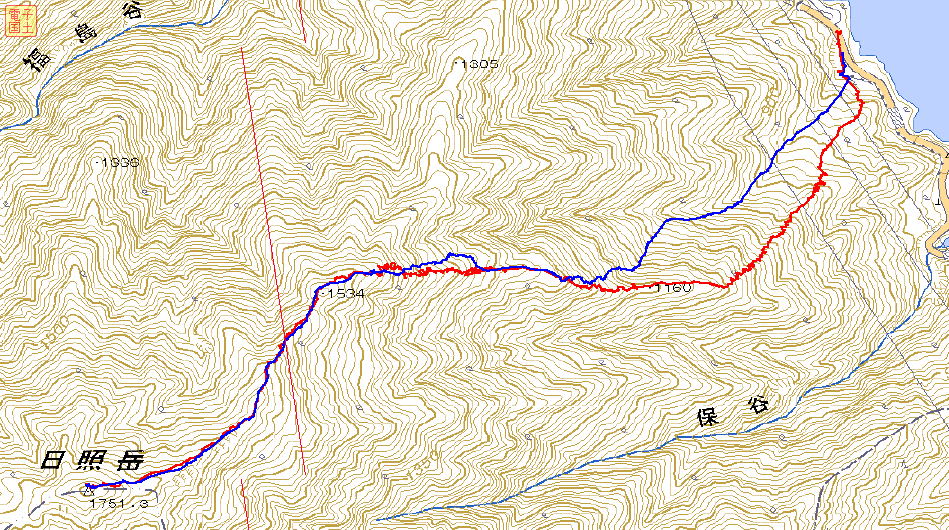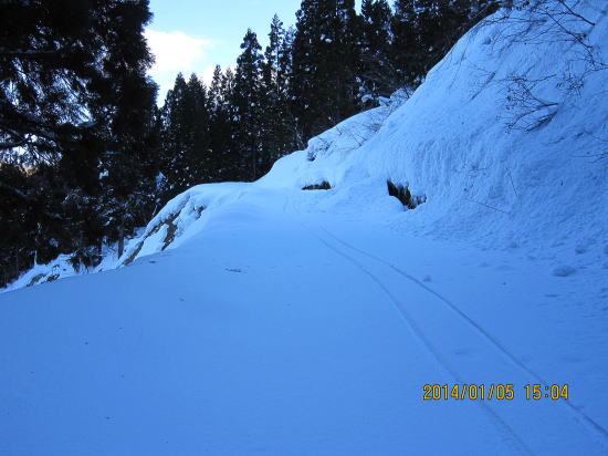 | お楽しみ斜面は標高差300mおりると林道にぶつかります。 | 林道一直線。 |