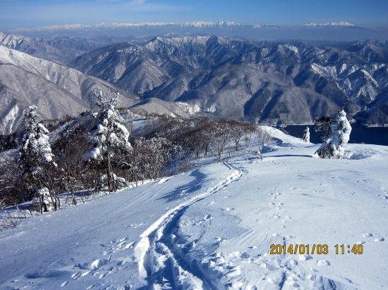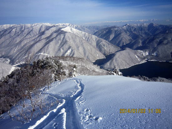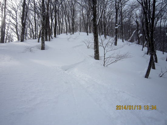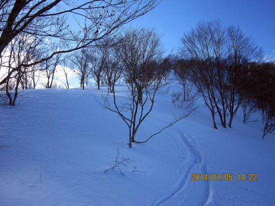 | お楽しみ滑降です。深雪のため斜度が小さいと止まってしまいます。 | 尾根部から北東斜面部に突入、灌木樹林のスラロームです。 |