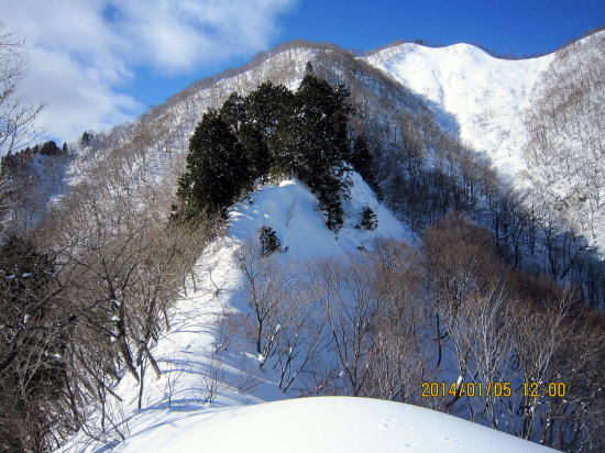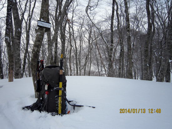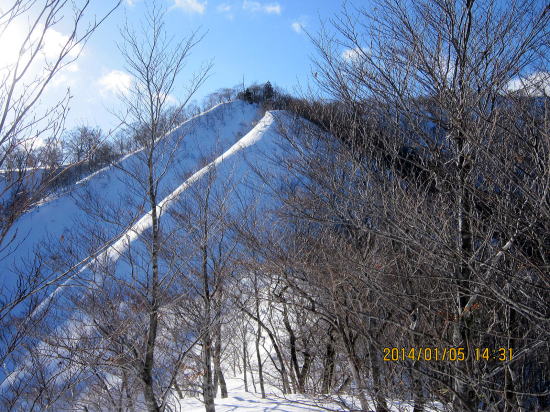| ところが厳しいやせ尾根が待っていた。途中スキーを担ぐほどの難所であった。ここより標高差300mに2時間を要した。。 | 山頂に着いたのは14:00すぎ、昼食タイムです。14:00山頂 |