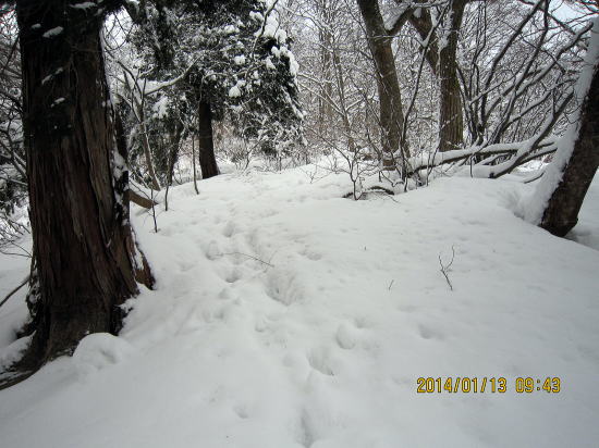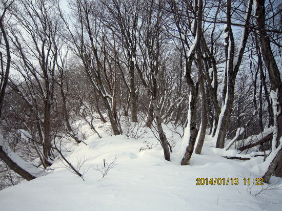 | 70㎝ほどの新雪です。 | 11:15尾根部700mに達しましたがヤブは濃いです。 |