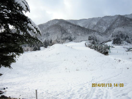 | スラロームから解放されると スキー場トップへ。 | お楽しみゲレンデ滑降。14:00到着。 |