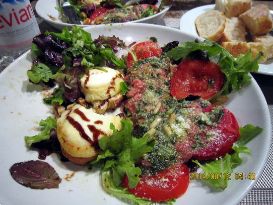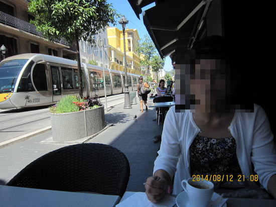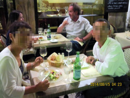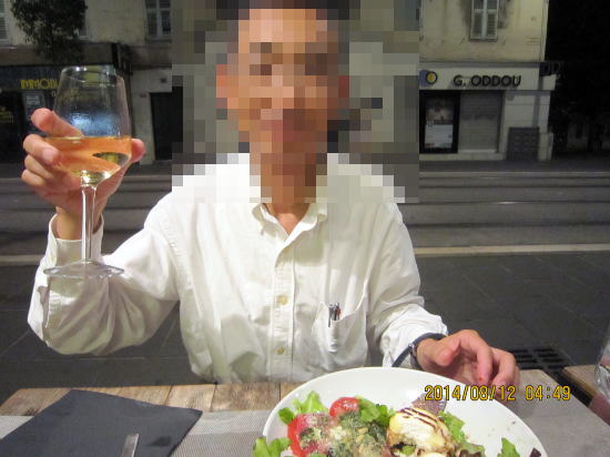 | 1日目の夜、レンタカーの使い方で一苦労。やはりバジェット等メーカーの方が使用説明がありよいかも。コンドミニアムから歩いて5分のニース家庭料理店での夕食です。ニース風トマトグリーンサラダ生の牛肉添え(右半分)とメインのフォアグラ上に甘いフランスチーズ載せバルサミコソースかけ。ドレッシングは薄味イタリアンですが酸っぱくありません。チーズが甘めでバルサミコソースとの相性が良かった。一皿ずつ注文してシェアして十分な量です。 | ここニースも夜は涼しいため,レストラン店外のテーブルの方が人気があります。私も楽しんでみました。 |