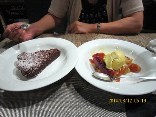 | メニューは左下のように黒板にフランス語で書いてあるだけです。納得いくまでたずねましたが、女主人は(一人で切り盛りしている)丁寧に対応してくれました。 | デザートはチョコレートケーキ(かなり甘っ)とアップルパイ。アップルパイは下はタルト生地でしっとりして美味。 |