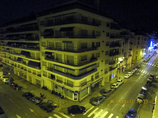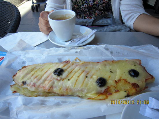 | 一度寝て目覚めるいつものパターンで深夜3時、コンドミニアムから見た近隣。まさに都会であまり経験したことのない世界。 | 朝食は部屋で食べ、一日の計画を立てます。昨日海辺コート・ダジュールまでジョギングをしているのでそこで泳ぐことにします。朝食は部屋で,昼食は近くのベーカリーカフェにしました。これはバゲット形のピザです。黒粒はオリーブです。5〜6ユーロだったと思いますが二人でシェアして少し足りないくらいでした。 |