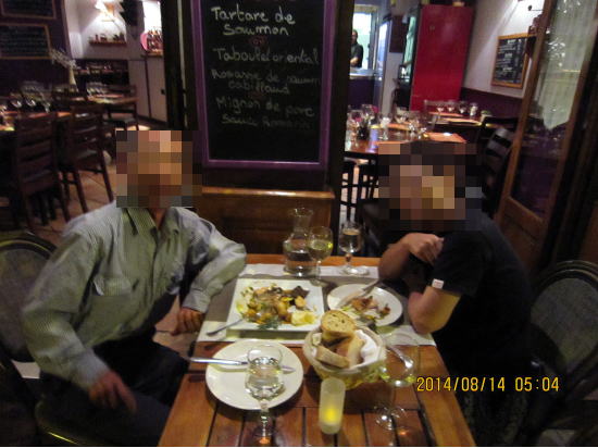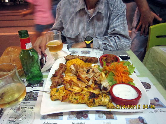 | 今日のディナーはトルコ料理です。ここニースではニース料理、イタリア料理、トルコ料理のレストランを多く見かけます。ワンプレートでカレー味チキン、串さしビーフ、ケバブ(豚肉)、ヨーグルトソースとチリソースがついています。19ユーロぐらいでシェアして十分でした。味は素直でとてもお値打ちでした。 |