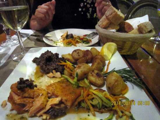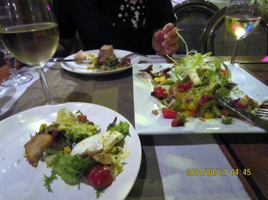 | コンドミニアム歩いて5分のフランス料理レストランに夕食に出かけました。内容はニース料理という感じです。ミックスサラダ美味しいチーズ付き。 | チキンのグリル、バルサミコソース味。黒豆とポテトのメイン料理です。 |