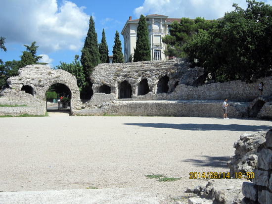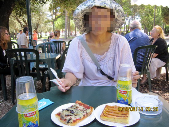 | 本日は健脚同士?、GPSにマティス美術館、シャガール美術館をポイントアップして徒歩で訪れることにしました。直線距離で1.5qほどです。ところが美術館は高台の上、道も複雑に入り込み、途中からバスに転向しました。ここはマティス美術館近くの円形闘技場跡です。 | シミエ公園内のマティス美術館鑑賞後、一角にある売店で昼食といきます。 |