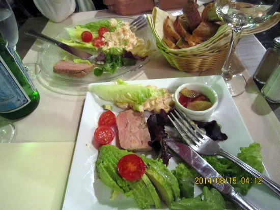 | ピザとアップルタルト。ピザは調理済みでしたが、まったく油濃さがなく美味しい一品でした。午後は公園から歩いて30分のシャガール美術館にいきました。聖書を題材にした作品がたくさんあり、関心を持って観ました。 | 帰りは歩いて50分かけてコンドミニアムまでもどりました。今日は最終日で「地球の歩き方」に掲載されていた旧市街の日本人経営するフランス料理店へ向かいましたが、あいにく予約いっぱい。歩きながら混み合っているフランス料理店を探しました。注文したのがアボガドとシュリンプのカクテルソースあえ(中央上)。野菜のピクルス(カップ),フォアグラ他でした。ここの料理は品があった。 |
