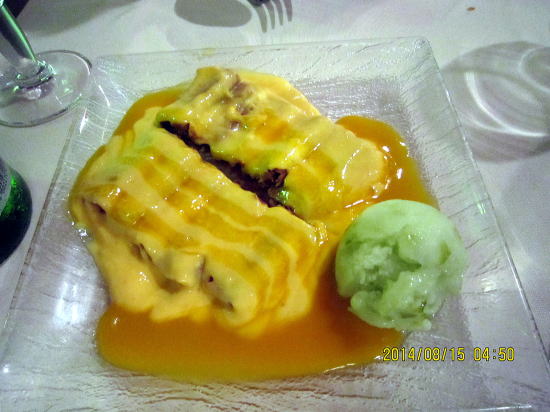 | みなさん、店内より店外のテーブルで食することがトレンド?ここはホテル街に近いためでしょう、英語メニューも併記されていました。 | デザートはクレープ+ライムのシャーベット+マンゴー・ジンジャーソースです。クレープの中身はイチジクを調理したもので言われないと気づきません。クレープの生地は見た目と違ってパリパリしていました。ソースのジンジャー風味はミントのように爽やかな後味を残します。この後トラムで帰宅。荷造りをして旅の終焉を迎えました。 |