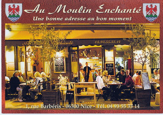 | スタッフに後ろの黒板とは異なる全メニューを書いた黒板で納得するまで ?説明してもらい、それでもへんなのは出されないか、びびりながらオーダーしました。何しろメニューはフランス語。説明は一部英語をまじりますが、味は想像するしかない。 | レストラン名はMoulin Enchante。コマーシャル用の絵はがきをもらいました。私たちが座っていたところはまさに右側のテーブルです。 |
