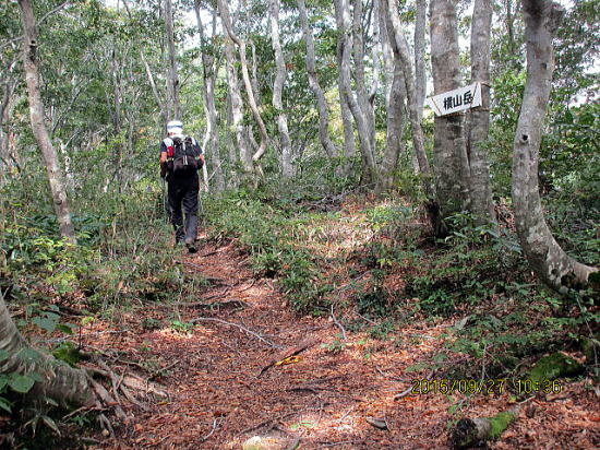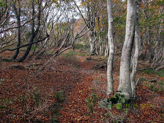 | ブナ林が見え始めた。 | 主稜線出合い、このあたりからベニタケ型のキノコ探しに夢中になる。 |