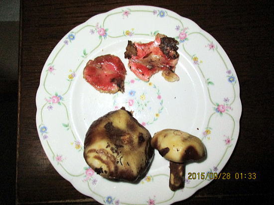 | ドクベニタケは傘は鮮紅色、味は辛い(苦い)が毒はない。チチタケ族のウズハツ、乳がシミとなったらしい。 | ブナ帯の中いろいろなキノコに目を奪われます。 |