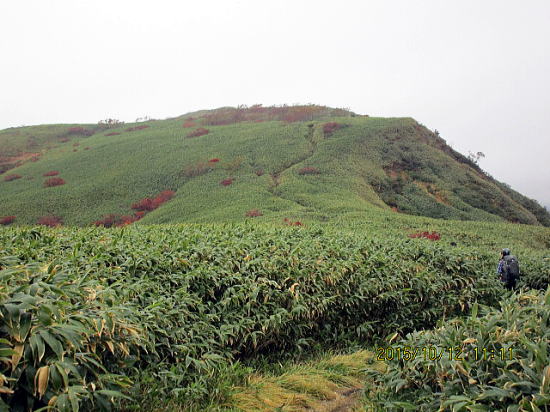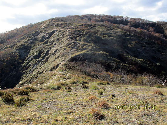 | 正面に左から先日登った国見岳、御座峰、大禿山。 | 5合目ドライブウェーからの登山道は健在なのでしょうか。うっすらありましたが獣道同然です。 |