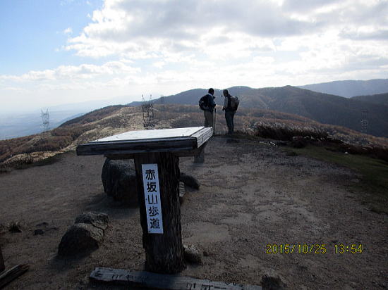 | 西峰と東峰の尾根中間地点、西峰が背景。 | 西峰と東峰の尾根中間地点、東峰が背景。琵琶湖を眼下に昼食です。 |