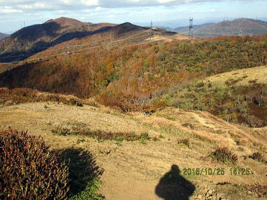| 冬型強風で空気が澄んでいます。東方には右奥:金糞山、左奥はこの前登った横山岳でしょう。 | 電波塔から黒河峠へ至る道は落ち葉が多くて道を見失うこともありました。 |
