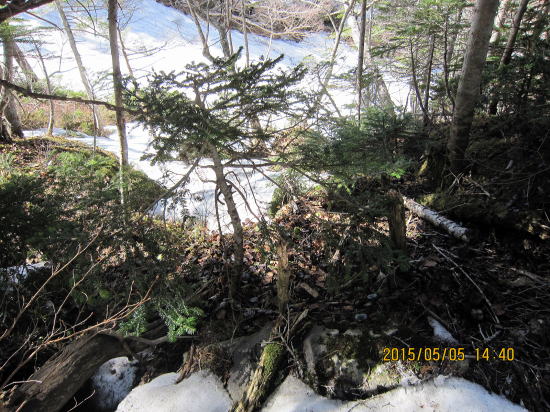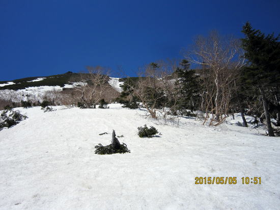 | 今年は雪が少なく沢へつながっていません。一番ヤブが薄いところで沢へトラバースですがご覧の通り苦戦です。 | 沢から稜線を望む。雲一つ無い快晴、朝のうちの強風もなくなりました。 |