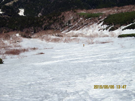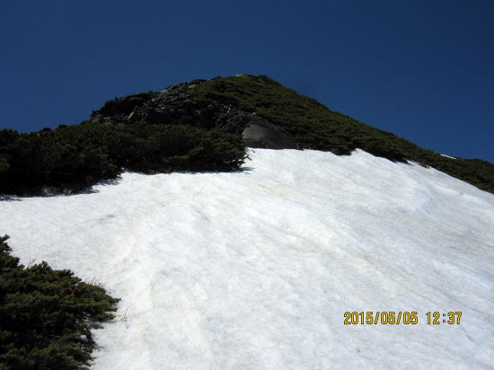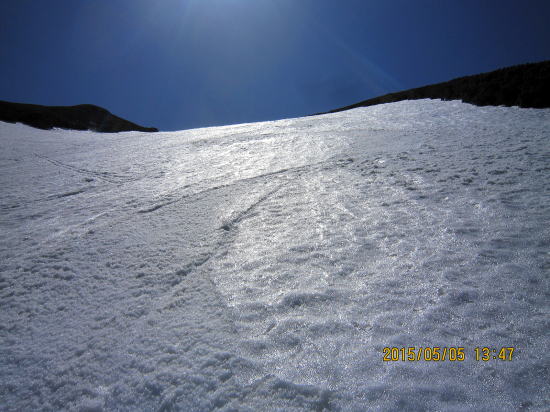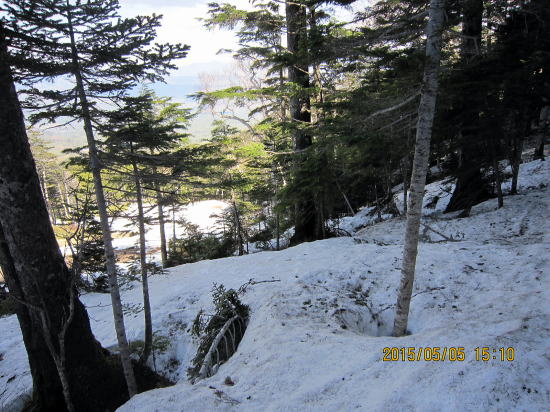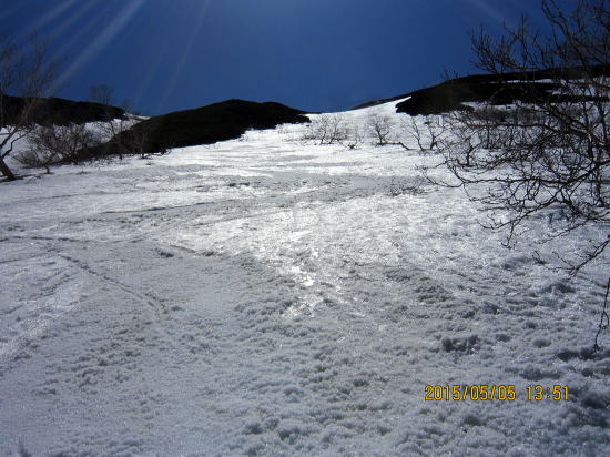 | 矢印が尾根から沢へのトラバース地点、今年は雪融けが早くスキーを脱がなければならなかった。 | 稜線到着。一昨年はもう1週後でも山頂まで雪がつながっていましたが、今年はここまでです。 |