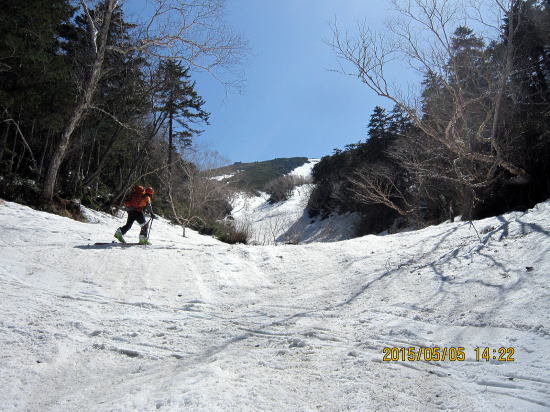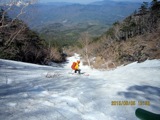 | 登り終えた尾根地点から滑った沢を見おろす。 | ゲレンデが見えてきました。樹林が濃く、穴も大きく難儀な下部樹林滑降でした。 |