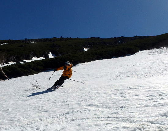 | ドロップポイントからの景色。マイヤスキー場が見えます。 | フィルムクラストした斜面を滑ります。快適です。 |