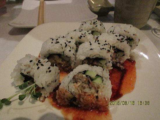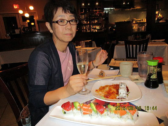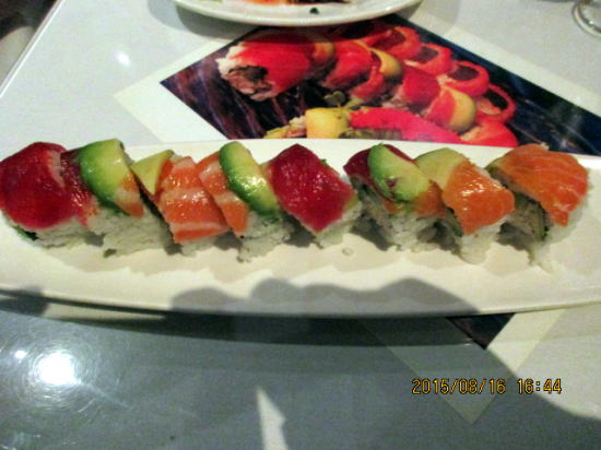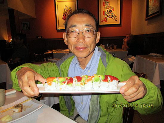 | 今日は移動で疲れたので夕食はビラ事務所前のサンセイ寿司バーでわかりやすいメニューを選ぶ。カリフォルニアロールの変形、キュウリとかにの唐揚げを中心にしたロール、とナンプラー入りチリソースでいただく。 | これは、有名の一品レインボーロールです。マグロ、アボガド、サーモンです。 |