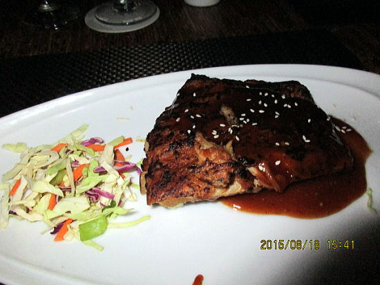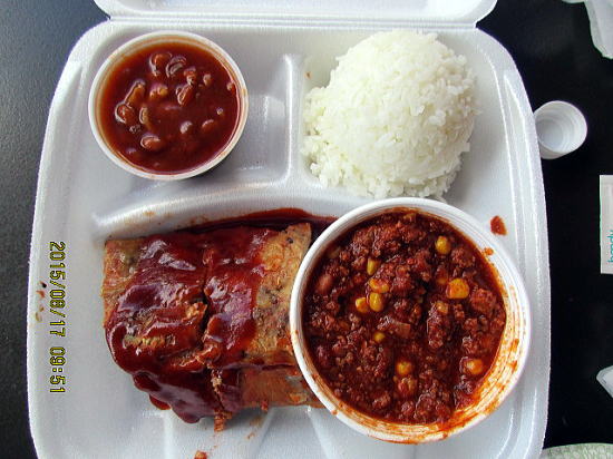 | リブのバーベキュウソースかけ10ドル、まあどこにでもあるおいしさです。 | 自転車で5分のナピリベイ。高級ホテルに囲まれた穏やかな海で魚やカメがたくさんいます。正面はメリマンズカパルア、ここはお高いので敬遠。 |