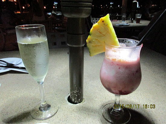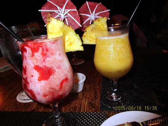 | ランチはアジアンテーストのホットモットのような店前テーブルで食べました。スペアリブ、牛肉のシチュー(右下)、ポークビーンズとスチームライス。コンボ(コンビネーション)なのでメイン2種(チキン、スペアリブ、ビーフシチューから)、サラダ2種(スチームライス、レッドライス、ポークビーンズ、マカロニサラダ)を選んで注文します。値段は12ドルで2人で余るほどです。 | ディナーは近くのホテル内のシーハウスレストランへ行きました。スパークリングワインとマウイオリジナルのラバフロー(カクテル)です。ラバフローはストロベリー、パイン、アイスクリーム、マンゴー、バナナなどをミックスしたカクテルでまるでフルーツジュースのような甘くてフルーティーな味わいで下戸の私もくせになりました。 |