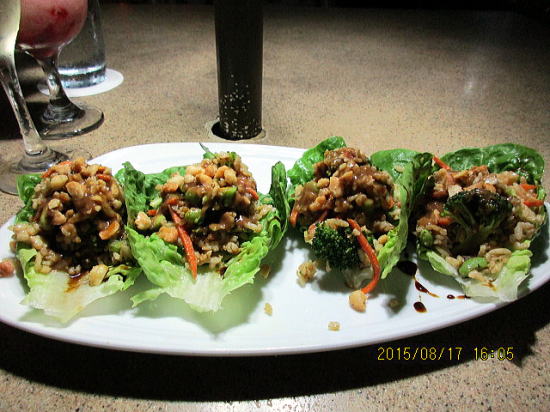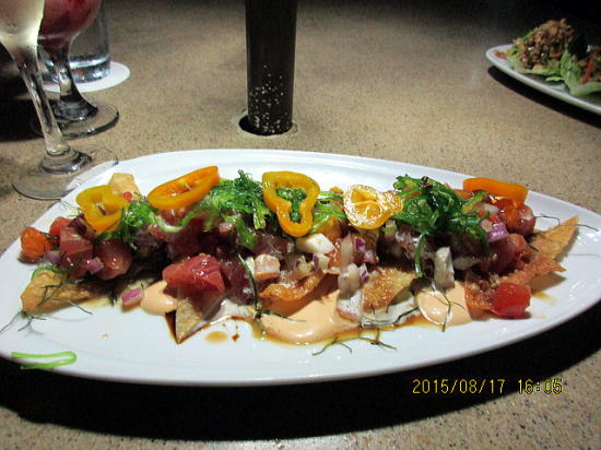 | ポキ・ナーチョ:マウイの定番海鮮料理、ポキというマグロのような刺身とタマネギ、トマト、ワンタンチップス、パプリカ等としょうゆとマヨネーズソースであえたもので日本的な味がします。13ドル。 | ココナッツ・クラステッド・シュリンプ:エビをココナッツなどの木の実とタイ(チリソース)でくるんだ濃厚な料理、当初、肉がないのでチキン添えをオーダーしたがスタッフが忘れていて幸いであった。13ドル、チキン5ドル |