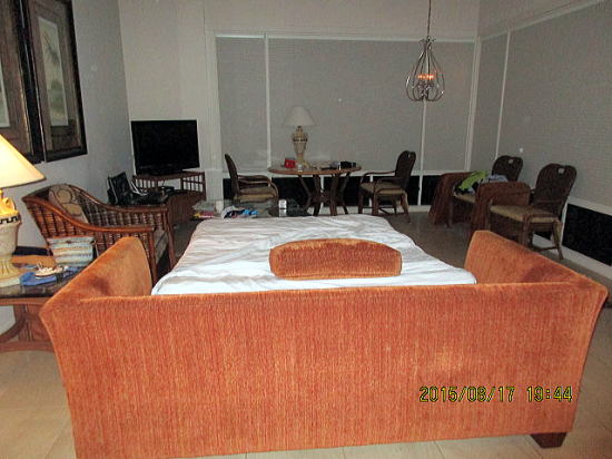| レストランの前は海です。 | リビングのソファは広げるとベッドになります。 |