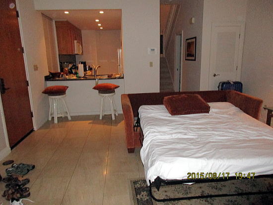 キッチンと階段 。1ベッドルームなので2階にはキングサイズベッドが一つあります。 |