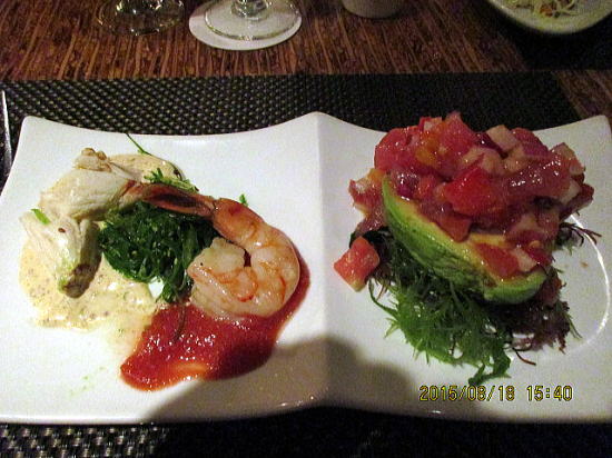 | 昨日と同じラバフロー(左)、とシーハウスパンチ(店オリジナル)マンゴーをベースにしココナッツその他フルーツをミックスしたカクテル各8.5ドル。 | かにとえびのチリソースとレムラードソース(ピクルス+マヨネーズ等)仕立て、アボガドとアヒ刺身イタリアン風味。13ドル。前菜なの薄味で軽いがカクテルには合う。 |