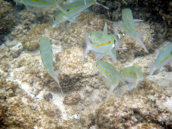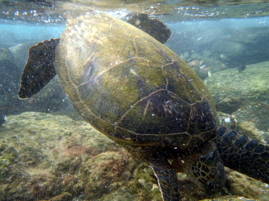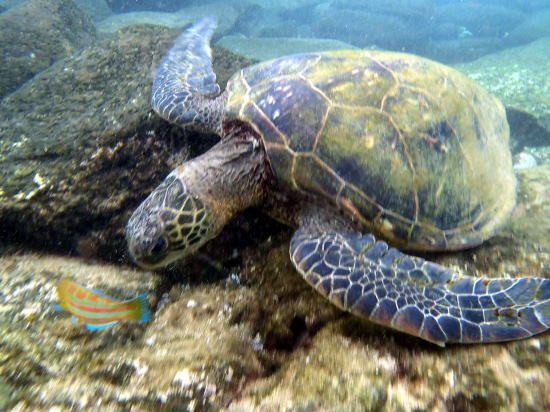 | ウミガメが3匹もいました。大きいものは1mくらい、小さいものは60㎝くらいでびっくり。岩の海草を盛んに食べています。 | ウミガメはまったく人見知りしません。体が大きいので人が波に揺られるのと同じ動きをするので写真が撮りやすいです。ただし海の掲示板にカメには触れないように御触書があります。小魚はリュウグウベラ。 |