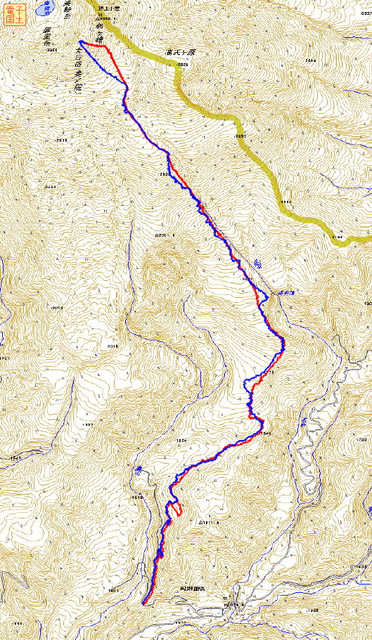 | 岳谷滝上部のあたりで少し疎林になりました。 | 2300m森林限界です。赤布とGPSを併用します。 |