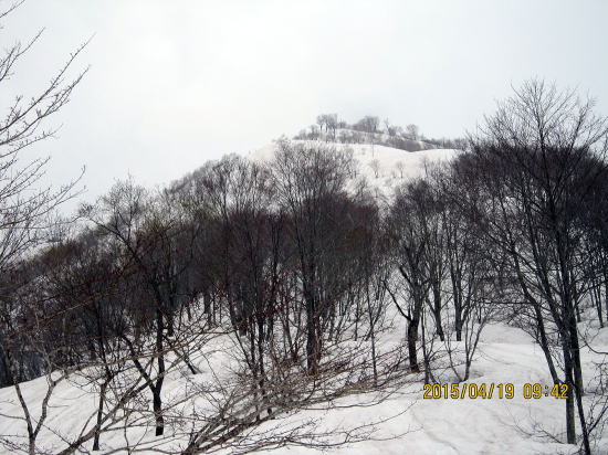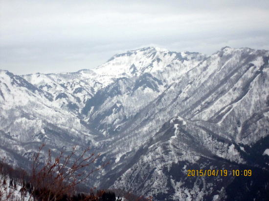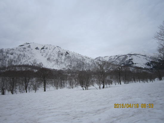 | 当初は自転車+銚子ヶ峰を計画していたが除雪してなくて断念。ここから可能な薙刀山(なぎなた)をめざす。牧場跡から望む薙刀山(なぎなたやま)。 | 天候は 夕方から崩れる予定。ところが朝から急速に雲行きが悪化。ここから登ることのできる野伏ヶ岳の東尾根を往路に決める。正面右のラインが東尾根で初体験である。 |