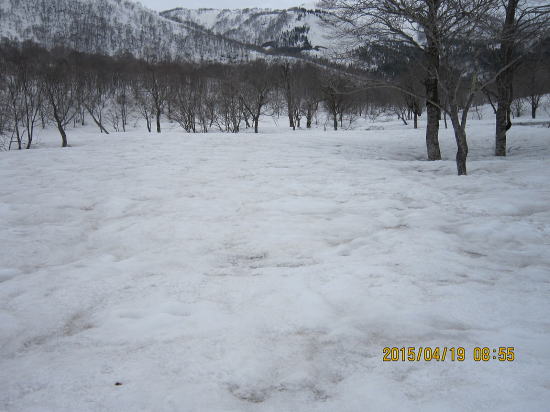 | 雨による凹凸の激しい平原を進む。東尾根末端が見えている。 | 取り付きはヤブは濃いが、雪は締まっておりクトーがしっかり食い込む。 |