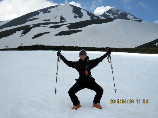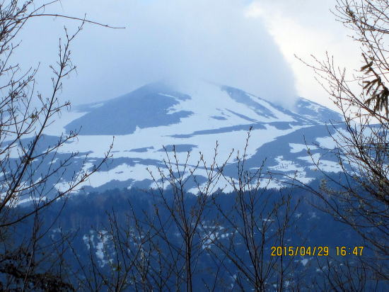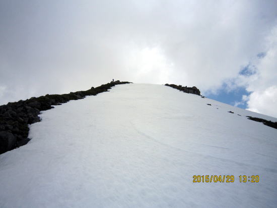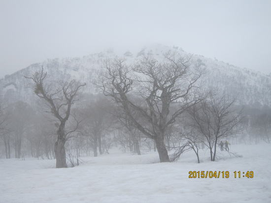 | 黄砂で汚れ、雨で山頂まで穴ぼこまるけである。 | 山頂はガスと強風と雨、安全のため、シール装着のままでジョンクションピーク(尾根合流地点)まで下り、滑降モードに切り替える。写真はジョンクションピークより50m滑って視界が確保でき上部を眺める。写真補正で明るく見えるが実際は次の写真が写実的だ。 |