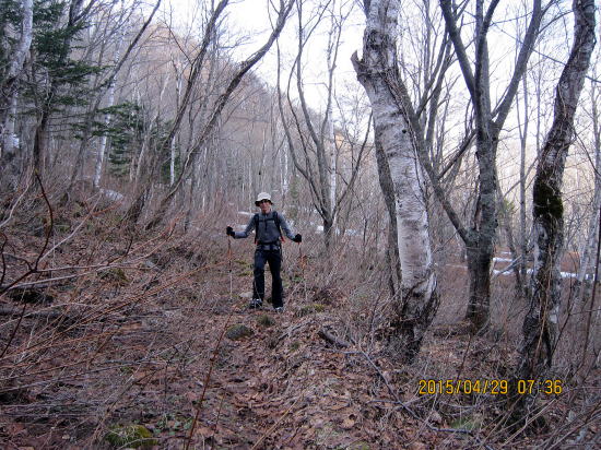 | 小さなブリッジを越すT氏。 | 懐かしい景色、シラカバ尾根に始まる岳谷右岸尾根の始まりです。 |