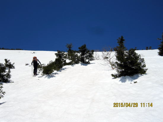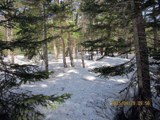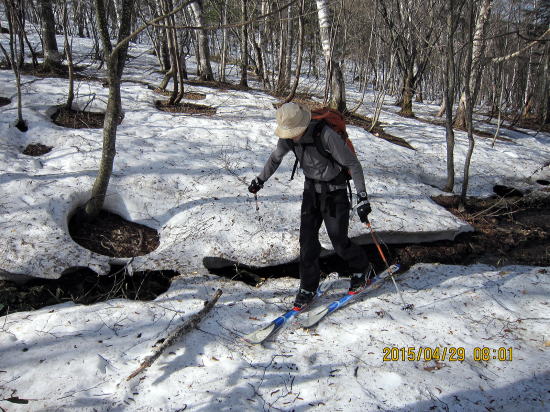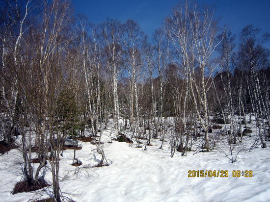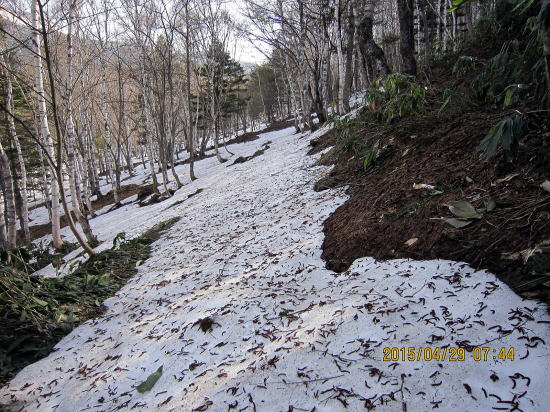 | 雪融けの旧登山道を歩む。今日は越後からきたテレマーカーさんといっしょになりました。初の乗鞍野麦コースということで行動を一緒にすることになりました。 | 右岸尾根麓地点に近づくとようやく雪がつながってきました。スタートして1時間半後 です。 |