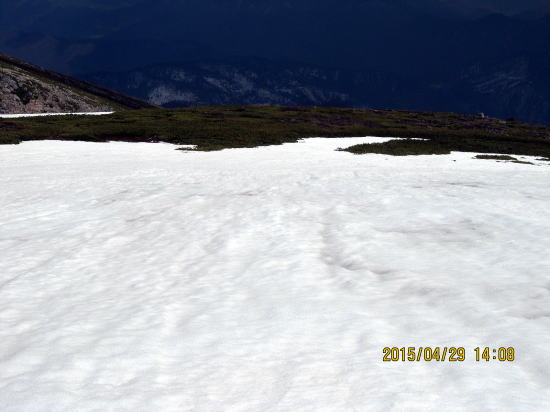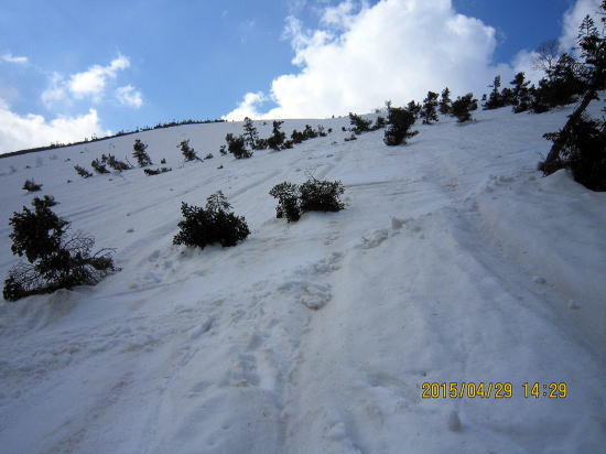 | 下に見えるのが第1プラトー。第1プラトーまで結構な斜面です | 第1プラトーから森林限界への急斜面。雪が大きく緩んでいます。 |