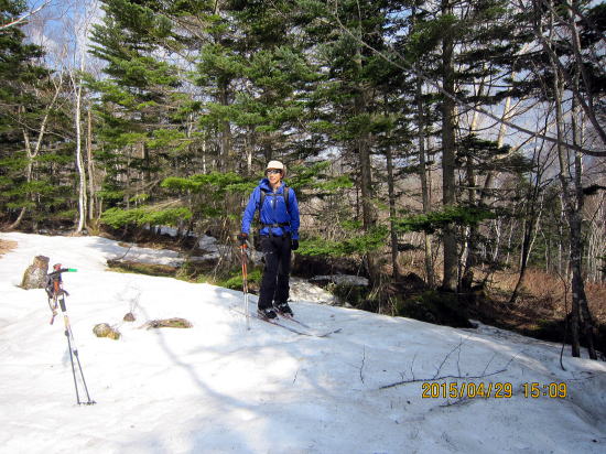 | さあ、ここから樹林帯に突入します。覚悟?を決めます。 | 40分後、飛騨山岳会の標識がある右岸尾根末端にきました。スキーを一旦担ぎます。 |