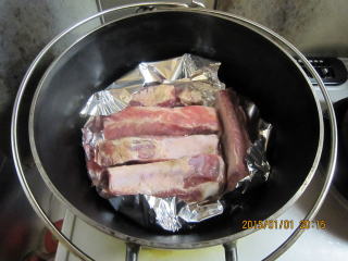 | 下ごしらえとダッチオーブン調理 | @塩と胡椒をまんべんなくかけこすりつけ5本は袋に入れて冷蔵庫で一晩保存する。 A1時間ほどおいてから、半分の5本をビニル袋にいれ(A)を入れてもみ冷蔵庫で一晩保存する。 Bダッチオーブン下に使ったコーヒー粉や紅茶だしがらをいれ煙がでるようになってから@とAを金網2段にして入れる。(右写真) C中火で15分、肉に串を刺して肉汁が透明であれば完成、血が混じるようならもう少し焼く。 |