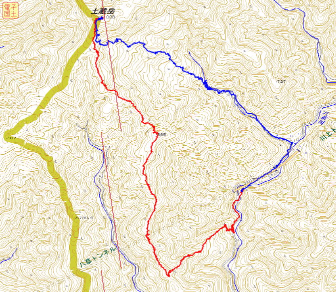 | 稜線に着き、今日の目的地土蔵岳右端を望む。 | ここはトンネルの真上・・・変な感じです。 |