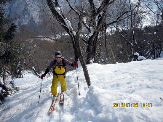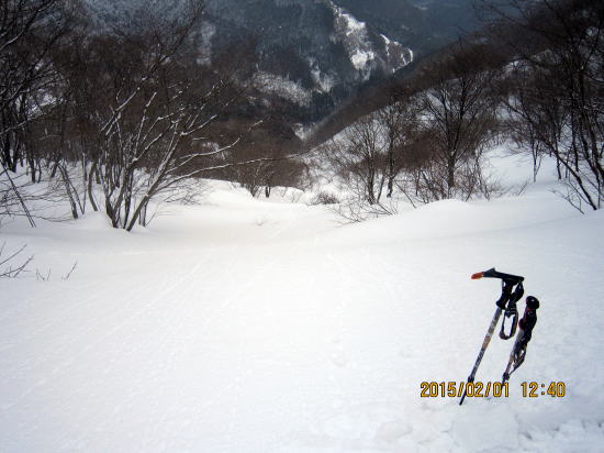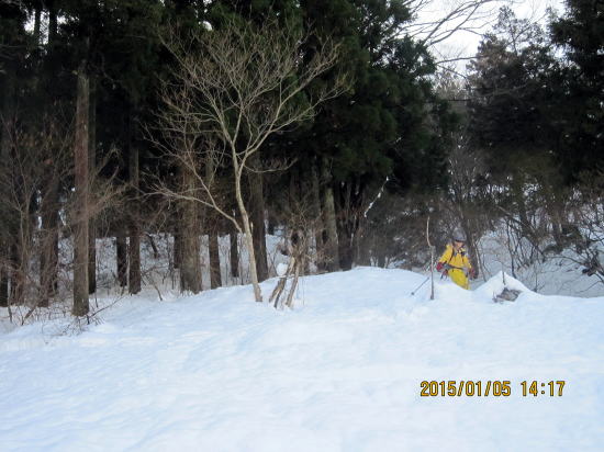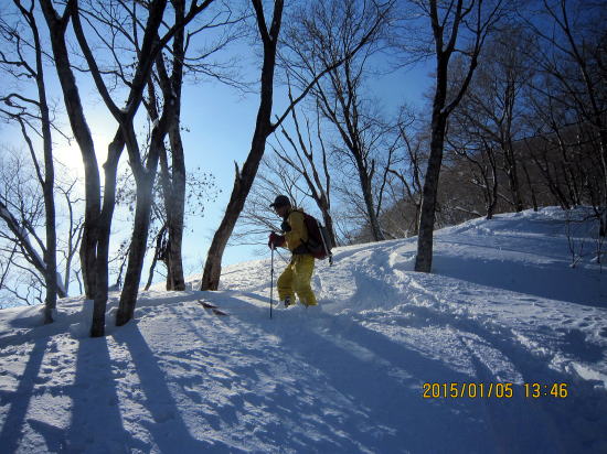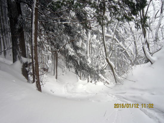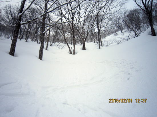 | しかし北斜面のヤブの悪雪になると安定性が出ます。太板ではバランスを崩し尻餅をついたり転倒することがありませんでした。 | 樹林、ヤブ帯から脱出、最後のゲレンデ滑走に入ります。 |