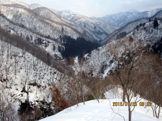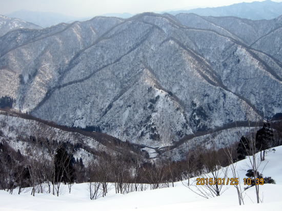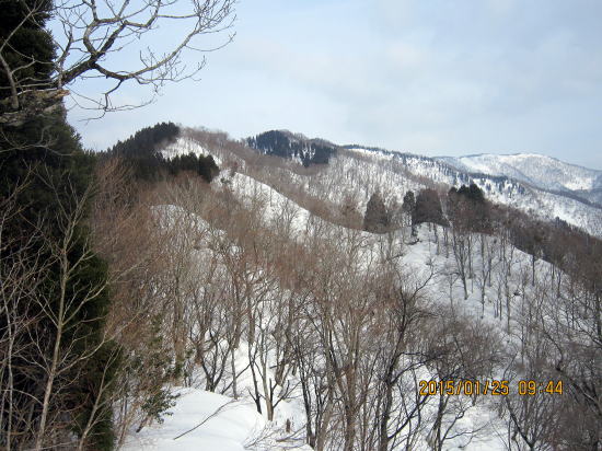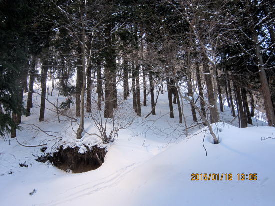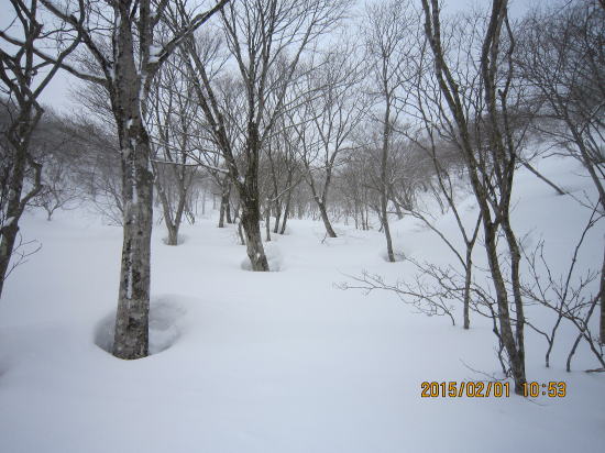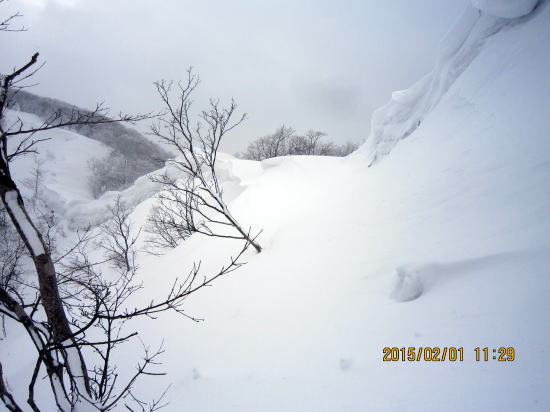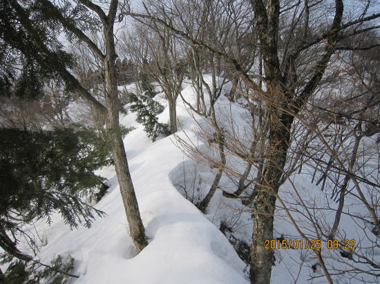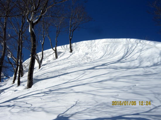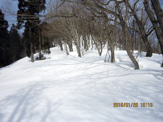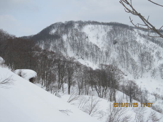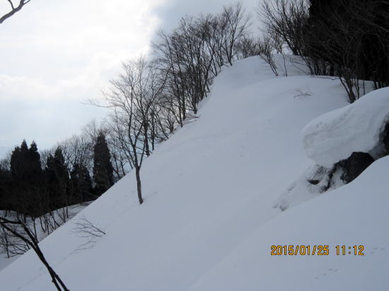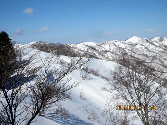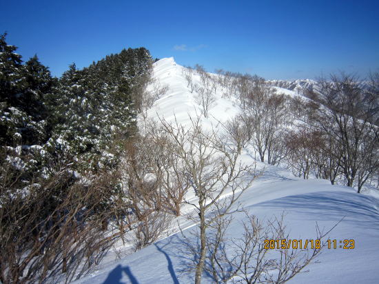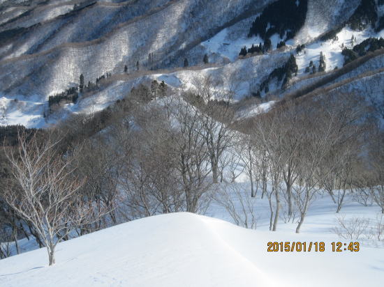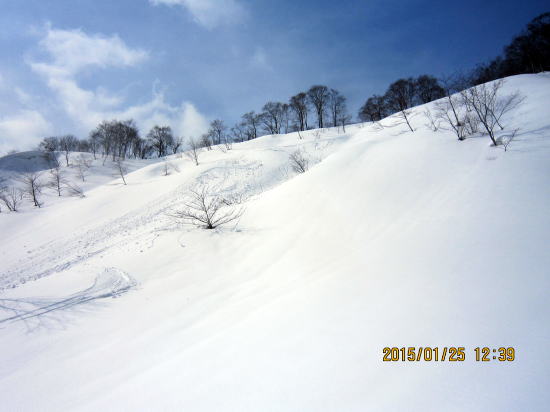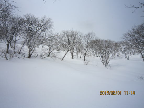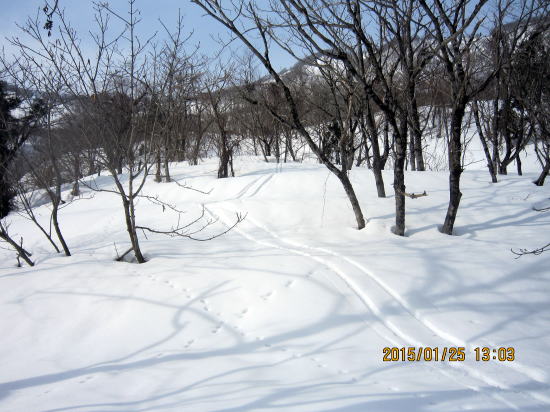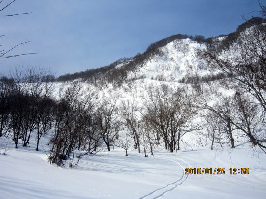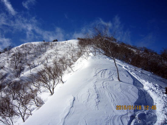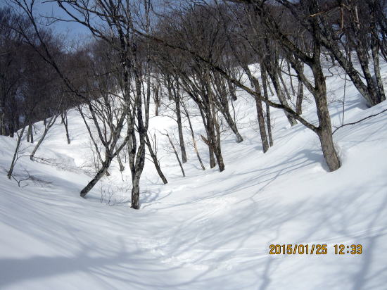 | 北方面灌木が多いですが、南方面展望は申し分なし。 | 滑降始めは尾根を滑るので灌木もあります。 |