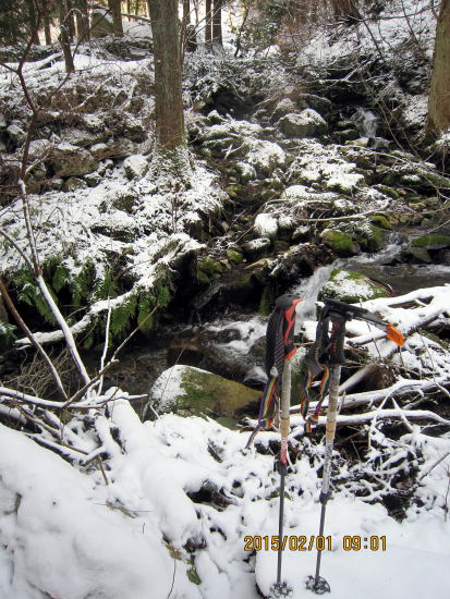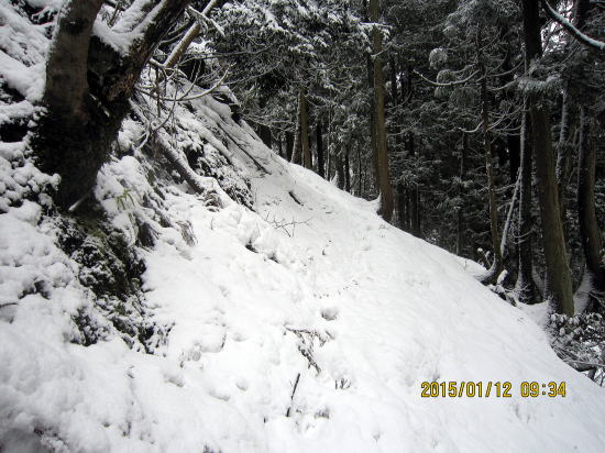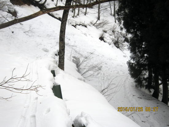 | かっての生活道、今の登山道は何とか板を痛めず登山可能。 | つららが伸びています。地元の方々が手入れに入っています。 |