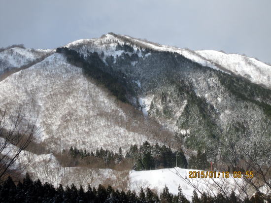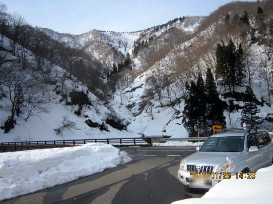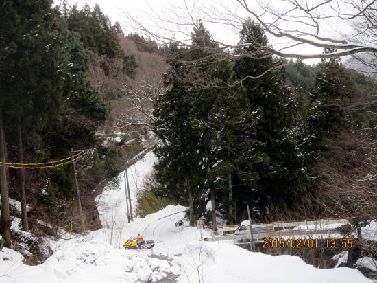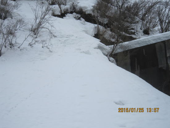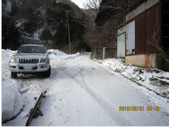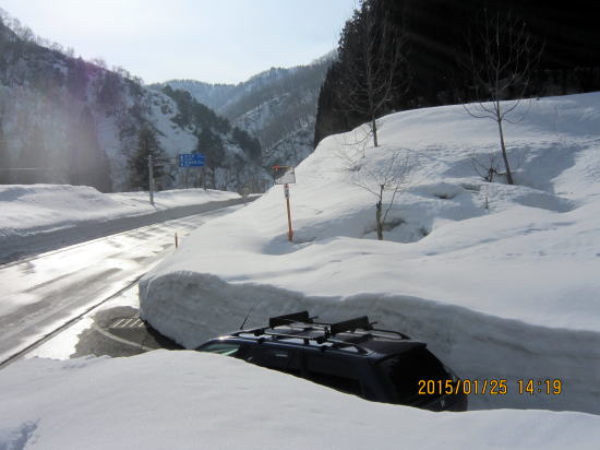 | 今年も時期になると雪が積もります。トンネルのおかげでここまで来られるようになりました。以前は川上集落まで。 | 法面取り付き、気温上昇、雪が柔らかく難儀しました。 |