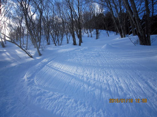 | バーンが広くなり、 体とスキー板が馴染んできました。上部を振り返る。 | うふっ、いい斜面です。 |