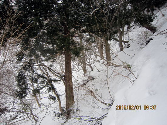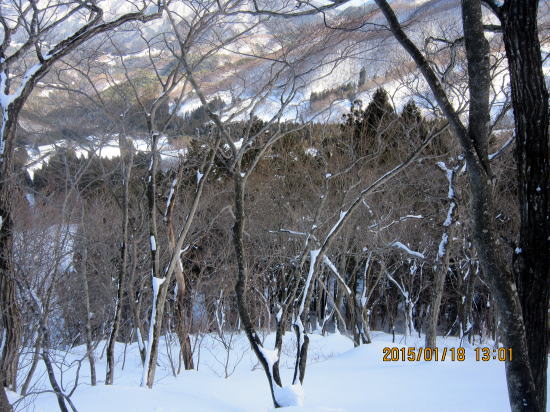 | 雪が少ないとトラバースも木の幹や枝で滑り難儀です。 | ようやく山スキー向きのヤブ山となってきました。標高650m付近。 |