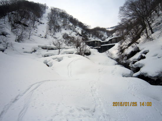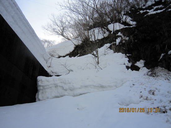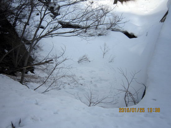 | 想像以上の雪融けで雪割れ、渡渉です。対岸からスキーを投げあげ足場を作って下降後、雪壁をよじ登りました。意外にすんなり行けました。渡渉後を振り返る。 | 次の課題は堰堤越えです。陽当たりなく新雪だと蟻地獄にならないかと心配していましたが締まっていて木のところまで階段登高でき幸運でした。 |