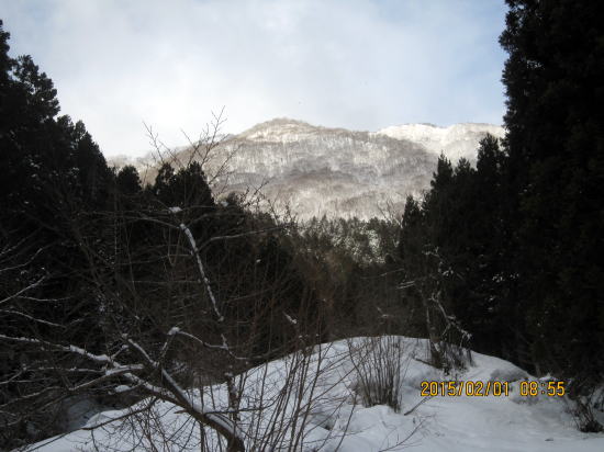 | 数日前にに降雪、集落から歩くのは初めて。偶然ケルンOBの小野ちゃんとPにていっしょになりました。正面は丁子山。 | やはり好き者のシュプールが残っています。これから登る正面尾根。 |